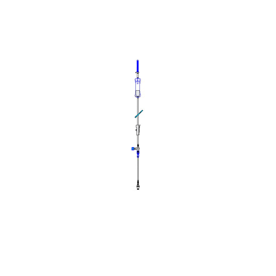 Soft pillow drip chamber with 200µm blood filter and with non vented spike, pump compatible tube, and with 3 way stopcock 150cm (narrow bore tube ID:1.37mm) from rotating Luer Lock adapter.